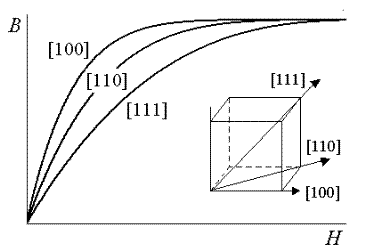 В кристаллах существуют направления, по которым образец намагничивается легко – оси легкого намагничивания, и такие направления, магнитное насыщение которых требует наибольших полей, – оси трудного намагничивания (рис. 5.22). Энергия магнитной анизотропии определяется как разность энергий намагничивания в трудном и легком направлениях. Она влияет на многие свойства магнитных материалов, применяемых в радиоэлектронике.