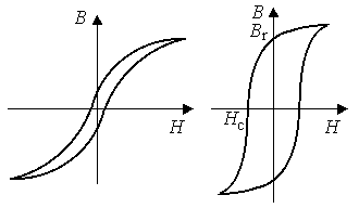 | Рис. 5.27. Петли гистерезиса для магнитомягких (а) и магнитотвердых (б) материалов |