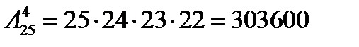 Пример 2. Научное общество состоит из 25 человек. Надо выбрать президента общества, вице-президента, ученого секретаря и казначея. Сколькими способами может быть сделан этот выбор, если каждый член общества может занимать лишь один пост?