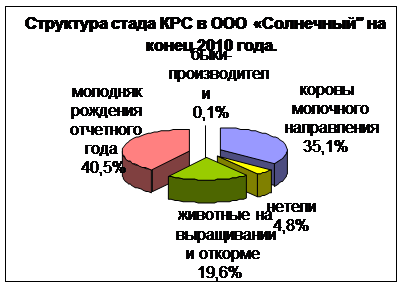Стадо молодняка КРС в течение двух лет имеет тенденцию к снижению, так с начала 2009 года поголовье молодняка КРС снизилось с 1350 голов до 953 голов к концу 2010 года, что ухудшает показатели отрасли животноводства ООО «Солнечный». На снижение поголовья молодняка КРС в 2010 году повлияло, несмотря на большое получение приплода в 594 головы, большое выбытие для продажи, реализации молодняка на мясо, несколько голов пало, а также перевод его в старшие группы.