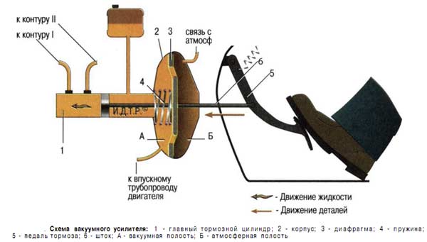 Для увеличения гидравлического давления в системе применяется вакуумный усилитель. Он обычно выполнен в одном модуле с главным тормозныи цилиндром. Усилитель имеет круговую камеру, разделённую на две половины с помощью упругой диафрагмы. Одна половина камеры сообщается через клапан с впускным коллектором мотора, где создаётся вакуум. Вторая половина камеры имеет свободный выход в атмосферу. При нажатии на педаль её действие усиливается давлением вакуума на поршень основного гидроцилиндра. В итоге гидравлическое давление в исполнительных цилиндрах увеличивает прижимное усилие колодок дополнительно до 30-40 кг.