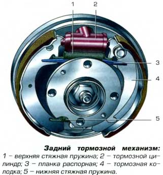 Барабанные механизмы имеют полукруглые колодки в виде полумесяца с фрикционными накладками с наружной стороны, нижние концы которых закреплены на неподвижной оси, а верхние концы могут раздвигаться под давлением поршней исполнительных цилиндров тормозов. Прижатые в нормальном положении друг к другу стяжными пружинами полукруглые колодки под давлением поршней раздвигаются и распирают внутреннюю поверхность вращающегося барабана. Трение поверхностей колодок и барабана приводит к торможению колеса. Для компенсации выработки трущейся поверхности имеется механизм самоподвода колодок к барабану.