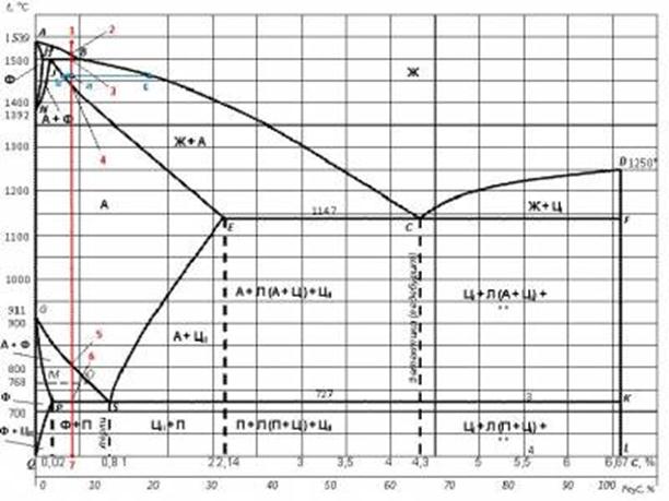 1. Вычерчивается диаграмма состояния железо - карбид железа c указанием в областях, ограниченных линиями ACD, AECF, GECF, GPQ, PSK: