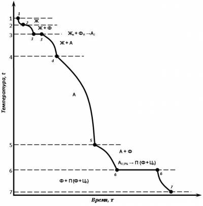 б) структурных составляющих аустенита (А), феррита (Ф), перлита (П), цементита (Ц), ледебурита (Л) и их смесей.