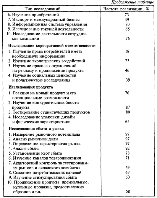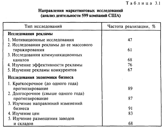 В табл. 3.1 приводятся данные, характеризующие частоту реализации отдельных направлений маркетинговых исследований, осуществленных американскими фирмами в 1991 г.