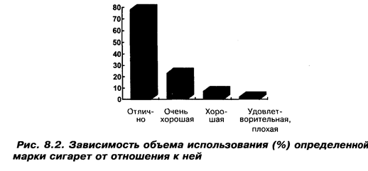 Возникает важный вопрос: определяют ли отношения, измеренные с помощью одного из методов, реальный выбор потребителей и их поведение на рынке? Положительное отношение к товару не всегда предопределяет его покупку. Потребитель, выразивший положительное отношение к определенному товару, не всегда желает или способен его купить. Эти обстоятельства необходимо учитывать при практическом использовании результатов исследования отношений, дополняя их данными других маркетинговых исследований. Однако многие исследования показывают сильную прямую связь между величиной положительного отношения к определенной марке товара и частотой ее использования. На рис. 8.2 приводятся результаты исследования зависимости между отношением к определенной марке сигарет и частотой ее использования.