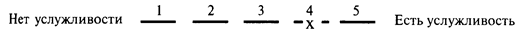 Далее формируется репрезентативная выборка клиентов данной компании, среди которых проводится анкетирование. Респонденты оценивают уровень достижения каждого критерия из приведенного списка. Рекомендуется в данном случае использовать модифицированную шкалу Лайкерта. Например, оценка по критерию «услужливость» будет осуществляться по следующей шкале: