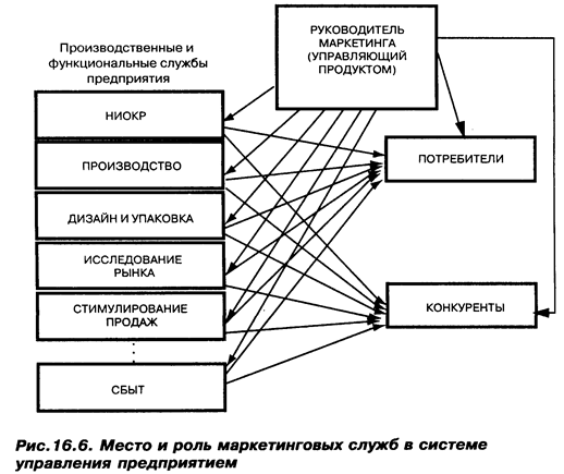Обобщенная схема, характеризующая место и роль маркетинговых служб в системе управления предприятием, представлена на рис. 16.6.