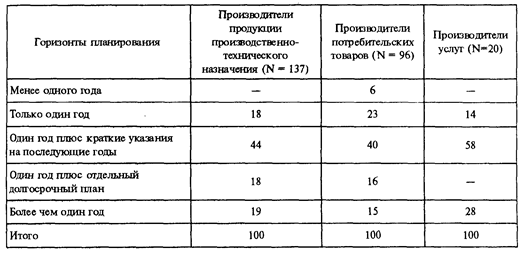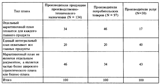 Статистические данные о планировании маркетинга в зарубежных компаниях весьма противоречивы. Исследования деятельности 162 американских и канадских промышленных фирм показали, что абсолютное большинство маркетинговых операций в них осуществляется в соответствии с планами, разработанными различными отделами компании (план производства, план сбыта продукции, план деятельности по обслуживанию потребителя, план рекламной кампании и т.п.). Однако в нескольких крупных фирмах и в целом ряде мелких не существует единого плана маркетинга.
