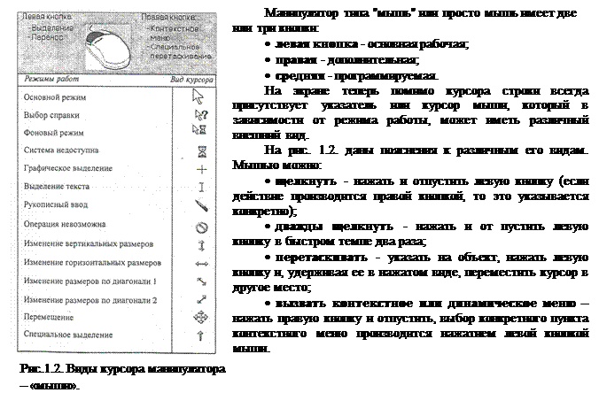 С помощью мыши мы управляем работой Windows и ее приложений: выдаем или отменяем команду на исполнение какой-либо операции, рисуем фигуру или выделяем ее фрагмент, переносим выделенный фрагмент текста или изображения в другую позицию. Перемещая мышь по столу (или коврику) в разных направлениях, можно установить курсор мыши в некоторую позицию на экране (иными словами указать курсором на определенный элемент), а затем послать сигнал машине, нажав левую или правую кнопку мыши.