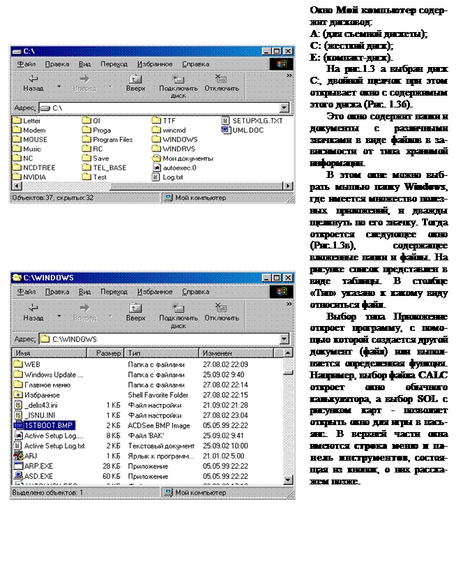 Значок "Мой компьютер" представляет на рабочем столе папку, как бы содержащую весь компьютер целиком. Чтобы просмотреть находящиеся на компьютере папки и файлы, нужно указать этот значок мышью и два раза нажать ее левую кнопку (Рис. 1.3).
