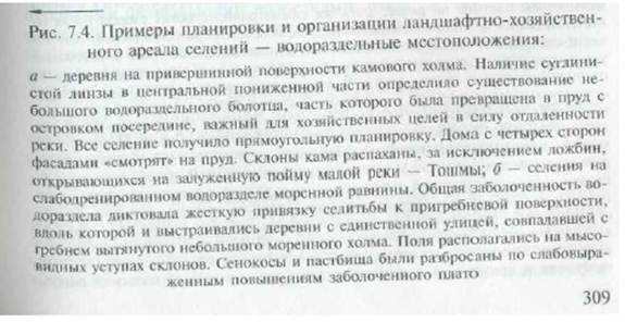 Прибрежные (на малых реках) поселения чаще всего наследо-вали древние славянские селища и имели линейную планировку. На надпойменных террасах дома выстраивались вдоль бровки тер-расы, выходя к реке фасадом; на пологих склонах долин дома часто «смотрели» наверх, а вниз к пойме спускались «зады» — деревенские огороды. Приозерные поселения получали кольце-вую планировку, жилая застройка выстраивалась подковой вдоль