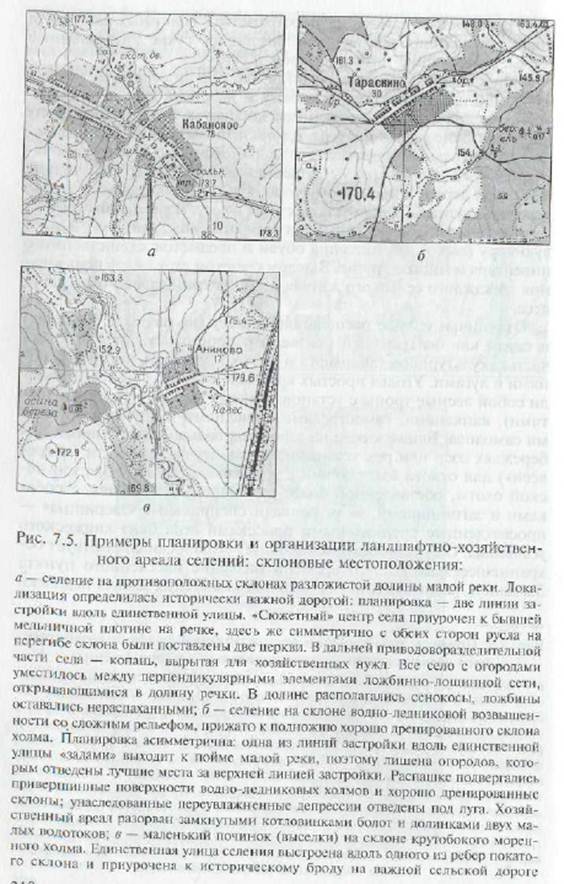 Водораздельных поселений до XV в. было сравнительно мало, приурочены они были к небольшим запрудам, ручьям и имели случайную планировку — кучную, звездообразную, продиктован-ную, как правило, пластикой рельефа и взаиморасположением транспортных путей. Так возникали «крестовые» планировки, когда застройка осуществлялась вдоль перекрещивающихся между со-бой дорог. Эти типы поселений чаще всего встречались на хорошо Дренированных холмистых моренных и водно-ледниковых равни-нах (рис. 7.4).