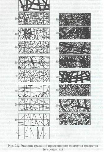 2. Далее следует указать общее проективное покрытие, оно опреде ляется как горизонтальная проекция наземных частей растений на повер хность почвы. Для луговых травостоев помимо общего проективного по крытия можно определить задернованность почвы. Проективное покры тие хорошо определяется с помощью эталонов градации проективного покрытия в процентах (рис. 7.8).