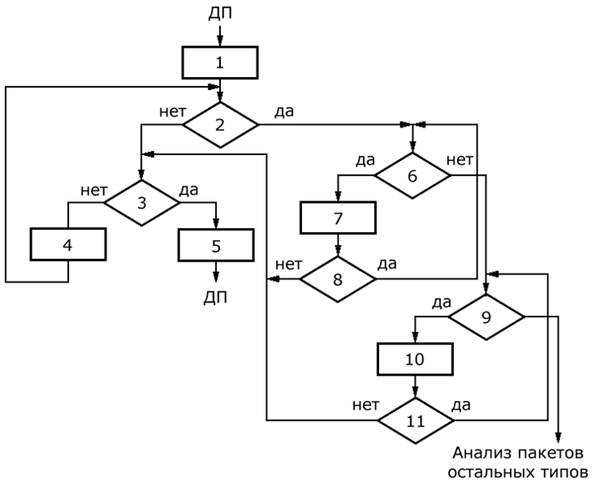 Операция 9-11. Аналогичны операциям 6-8, но при этом производится установка в очередь пакетов другого типа Овппм(j) («Вызов Принят») для обработки фоновой программой Рвппм. Далее программа продолжает аналогично анализировать пакеты других типов, формируя очереди пактов данные с приоритетом (Д1) Од1пм(j), и без приоритета (Д2) через Од2пм(j).