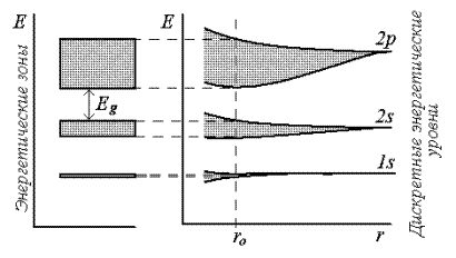 При конденсации изолированных атомов в кристалл, в котором они находятся на расстояниях порядка размера атома, кроме взаимодействия с ядром и электронами собственного атома каждый электрон испытывает действие других электронов и ядер кристалла. Волновые функции электронов перекрываются, что приводит к расщеплению энергетических уровней и превращению их в энергетические зоны (рис. 4.1).