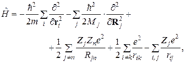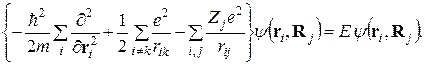 Первое слагаемое в (4.9) описывает кинетическую энергию электронов, второе – кинетическую энергию ядер, следующие слагаемые учитывают потенциальные энергии взаимодействия ядер друг с другом, электронов друг с другом и ядер с электронами. Решить задачу в таком виде невозможно из-за большого числа независимых переменных. Поэтому прибегают к упрощениям.