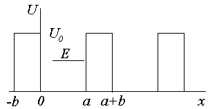 которой имеет периодический характер (рис. 4.2, а). Отыскать решение уравнения Шредингера для такого потенциала затруднительно, поэтому заменим действительную форму потенциальной ямы на прямоугольную (рис.4.2, б). Хотя такой потенциал существенно отличается от действительного, однако он сохраняет главную особенность – периодичность.