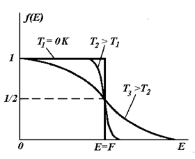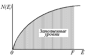 График распределения электронов по энергиям представлен на рис. 4.17, б. При абсолютном нуле температуры состояния в зоне проводимости заполнены вплоть до уровня Ферми, состояния выше энергии Ферми – свободные. При