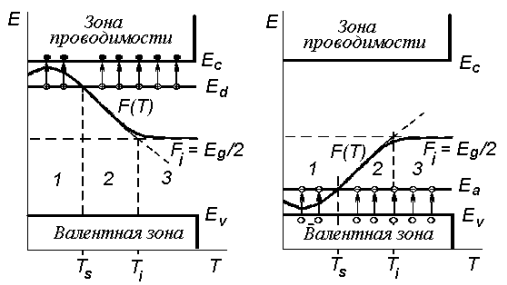 При последующем повышении температуры концентрация электронов в зоне проводимости растет, а концентрация электронов на примесных уровнях уменьшается. При выполнении неравенства
