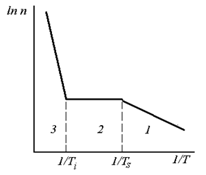 | Рис.4.21. Изменение концентрации носителей заряда для примесного полупроводника в зависимости от температуры |