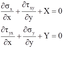 В плоской задаче неизвестными являются восемь величин три составляющих напряжения σx σy τxy, три составляющие деформаций εx εy γxy , две составляющие перемещений u v. Для нахождения неизвестных имеются два уравнения равновесия, три формулы Коши, уравнение сплошности и три формулы закона Гука