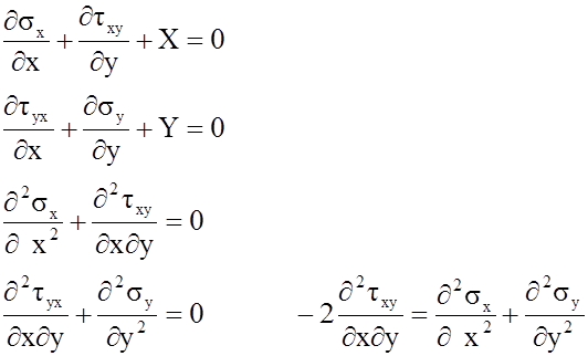 При решении задачи в напряжениях за неизвестные принимаются напряжения σx σy τxy. Для отыскания трех функций имеются два дифференциальных уравнения равновесия к которым добавляется уравнение сплошности выраженное через напряжения с помощью закона Гука.