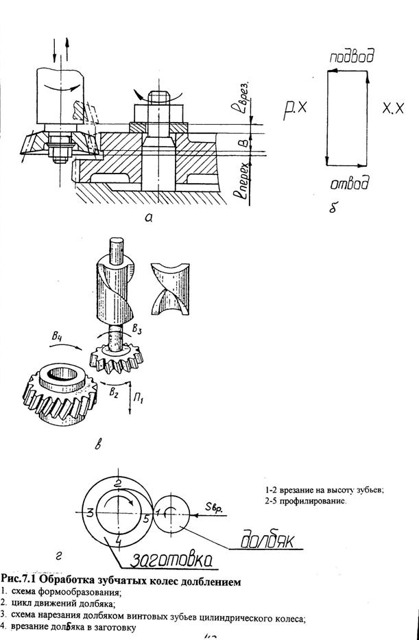 В начале нарезания зубьев при согласованном вращении заготовки и долбяка (движение обката) происходит радиальное врезание долбяка (или заготовки) до полной глубины резания (участок 1-2 на рис. 7.1 г). Для получения полностью обработанных зубьев на всей окружности заготовка должна после этого сделать полный оборот. Резание происходит только при прямом ходе долбяка, а при обратном холостом ходе шпиндель долбяка или стол несколько отводится, образуя зазор между инструментом и заготовкой для устранения трения задних поверхностей долбяка во впадине нарезаемого колеса.