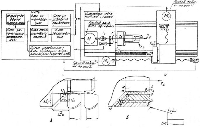 Рис. 11.4. Токарный станок с ЧПУ: а – структура числового программного управления токарным станком; б – схема перемещений инструмента при изготовления детали; в – формирования скорости подачи вдоль контура.
