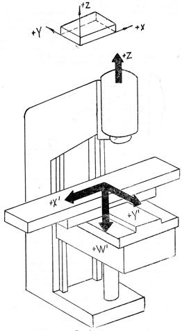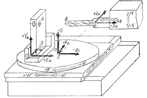 Координатные оси рабочих органов станка, перемещающих заготовку, направлены: противоположно соответствующим осям рабочих органов, перемещающих инструмент, и их обозначают теми же буквами, но со штрихом.