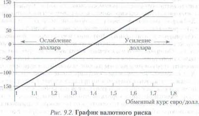 Величина валютного риска, который можно хеджировать, измеряется с помощью статистических величин — дисперсии и средне- квадратического отклонения (считается в единицах изменчивости фактора — валютного курса). Одним из самых распространенных методов изменения подверженности компании валютному риску является график риска (рис. 9.2). График риска — это графическое выражение взаимосвязи между прибылью (убытком) компании и изменением валютного курса, создающим эту прибыль (убыток).