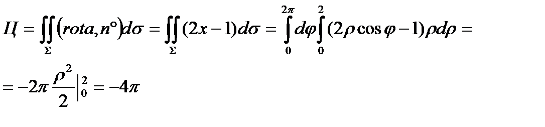 2. Для вычисления циркуляции по теореме Стокса выберем какую-нибудь поверхность Σ, натянутую на контур L. Естественно в качестве Σ взять круг, имеющий линию L своей границей. Согласно выбранной ориентации контура нормаль n° к кругу необходимо взять равной k: n°=k. Далее