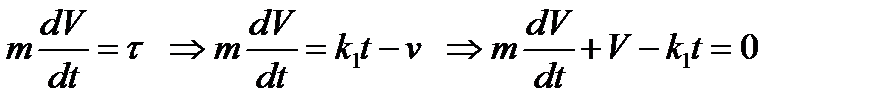 Пример7.3: Материальная точка массы m=1г движется прямолинейно, на нее действует в направлении движения сила, пропорциональная времени с коэффииентом к1=2*10-5 кг м/с, и сила сопротивления пропорциональная скорости, с коэффииентом к2= 0,003кг/с. Найти скорость точки через 3сек после начала движения, если начальная скорость