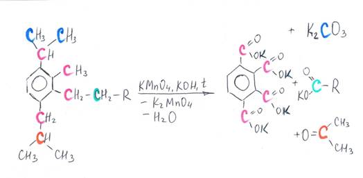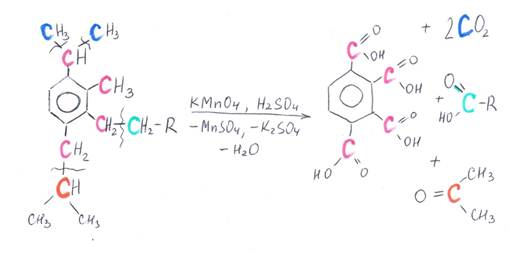 Ниже в схемах представлены возможные варианты окисления производных бензола в кислой и щелочной среде. Разными цветами выделены атомы углерода, участвующие в окислительно-восстановительном процессе. Выделение цветом позволяет проследить «судьбу» каждого атома углерода.