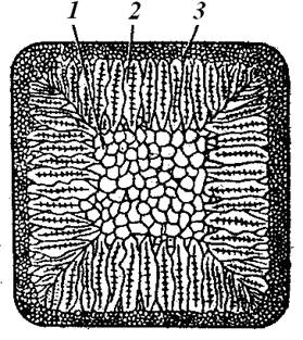 Размер и форму макрозерна оценивают как в линейных единицах, так и в условных баллах. Особое внимание обращают на различие размеров зерен, наличие зон резкого перехода от крупнозернистой к мелкозернистой или от столбчатой к равноосной структуре. По форме и ориентировке зерен определяют направление движения фронта кристаллизации при затвердевании отливки (рис. 3). Контроль ориентировки макрозерен приобретает особо важное значение для отливок, полученных методами направленной кристаллизации (лопатки газовых турбин, постоянные магниты и т.п.). Нарушение однородности ориентировки макрозерен в этом случае приводит к резкому ухудшению комплекса эксплуатационных свойств.