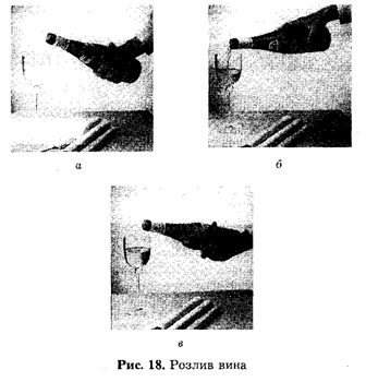 Держа, ручник в левой руке на безымянном пальце (а), официант подходит к заказчику с правой стороны и наливает ему в рюмку пробный глоток вина (б). Затем слегка поднимает горлышко бутылки и поворачивает ее вокруг оси вправо, чтобы капли не упали на скатерть (в). Горлышко бутылки промокают ручником, находящимся в левой руке. Так же предлагают и подают напитки в графинах. Получив согласие заказчика, официант разливает напиток (вначале женщинам, затем мужчинам), продвигаясь вдоль стола по часовой стрелке, в последнюю очередь напиток доливают заказчику. Бутылку с оставшимся вином ставят на приставной столик и надевают салфетку, сложенную воротничком (галстуком), чтобы при дальнейшем розливе вина капли не падали на