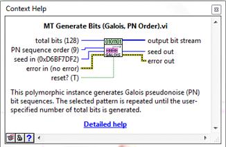 В ходе создания моделей возникают всевозможные вопросы: о предназначении конкретного блока, о типах входных и выходных переменных, об их допустимых значениях и т.д. На подавляющее большинство вопросов, касающихся работы Labview и её составляющих, можно получить ответы не прибегая к сторонним источникам информации. Для этого достаточно заглянуть во встроенный справочник (Help) Labview. При работе в некоторых случаях очень полезной может оказаться контекстная помощь (Context Help). Для её отображения следует нажать сочетание клавиш Ctrl+H. При этом при наведении указателя на элементы лицевой панели или блок-диаграммы будет отображаться краткая информация, касающаяся этого элемента. Например, при включенной контекстной помощи при наведении на блок генерации псевдослучайной последовательности будет показано следующее всплывающее окно (рис 1.)