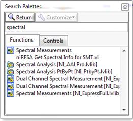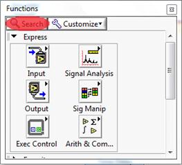 Для того чтобы использовать блоки в создаваемом виртуальном инструменте, необходимо переместить их на блок-диаграмму или лицевую панель из окна функций (Functions) или управляющих элементов (Controls). Наборы блоков, находящиеся в этих окнах, называются палитрами. Если вы знаете частичное или полное название блока, который необходимо добавить в модель, но не знаете, где именно в палитре этот блок находится, то можно использовать кнопку Search, которая будет искать совпадения по словам.