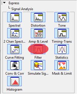 Для фильтрации будут использоваться простейшие блоки LabVIEW из палитры Express. В данном задании потребуется несколько блоков Filter. Найти их можно по пути ExpressSignal AnalysisFilter, либо с помощью кнопки Search (рис 3.1.).