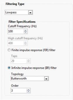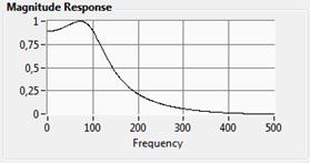 Конечный набор фильтров будет состоять из 3 блоков Filter, которые будут соответствовать НЧ-фильтру, ВЧ-фильтру и ПП-фильтру (фильтр нижних частот, фильтр верхних частот и полосно-пропускающий фильтр соответственно). Чтобы поменять тип фильтра необходимо в настройках изменить параметр Filtering Type. Для НЧ-фильтра параметр Filtering Type ставится Lowpass, для ВЧ-филтра - Highpass, а для ПП-фильтра - Bandpass. После указания типа фильтра необходимо указать его полосы пропускания. В данном примере зададим следующие значения: для НЧ-фильтра Cutoff Frequency(Hz)=100, для ВЧ-фильтра Cutoff Frequency(Hz)=400, для ПП-фильтра параметры Low Cutoff Frequency(Hz)=200, High Cutoff Frequency(Hz)=300. Помимо вышеуказанных настроек также можно изменить топологию фильтра (Topology) и его порядок (Order). Чем выше порядок фильтра, тем меньше неравномерность АЧХ и тем больше фильтр похож на идеальный. В разделе View Mode можно получить предварительную информацию о фильтре: