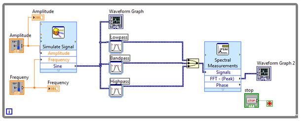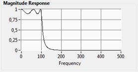 После ознакомления с параметрами фильтров и их соответствующей настройки перейдем к созданию модели. В ходе выполнения задания будем использовать гармонический сигнал. Соединим каждый из этих фильтров с выходом Simulation signal. А затем, кликнув правой кнопкой мыши на выходе любого из фильтров, создаем блок Merge Signals из палитры Signal Manipulation Palette (Right clickSignal Manipulation PaletteMerge Signals). Добавим в модель анализатор спектра и осциллограф, на котором спектр будет отображаться. Также добавим осциллограф для отображения нефильтрованного сигнала. Соединим выход Merge Signals с анализатором спектра Spectral Measurements, а анализатор спектра - с осциллографом. На лицевой панели добавим элементы управления, которые будут регулировать амплитуду и частоту входного сигнала (ExpressNumeric ControlsVertical Fill Slide). Назовем их Amplitude и Frequency и подключим к соответствующим входам генератора сигнала. Настроим их так, чтобы максимальная частота сигнала равнялась 500 Гц, а его максимальная амплитуда - 10.