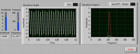 Данные регуляторы очень удобны, но у них есть один существенный недостаток - сложность установления точной величины амплитуды или частоты. Если необходимо знать точное значение, которое установлено на регуляторе, можно поступить следующим образом: добавить на лицевой панели индикатор (ExpressNumeric IndicatorsNumeric Indicator), а затем подать на эти индикаторы значения с управляющих элементов (соединить проводами на лицевой панели).