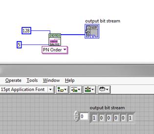 Создадим элемент управления для входа total bits (подадим константу на этот вход). Появится блок с переменной, доступной для редактирования. Сейчас она по умолчанию равна 128. Теперь нам также потребуется создать константу для входа PN Sequence order, который определяет порядок псевдослучайной последовательности. При этом, если порядок псевдослучайной последовательности равен, то псевдопоследовательность периодична и имеет период равный. Выставим значение N равным, например, 5. Теперь создадим Indicator на выходе нашего блока (выход output bit stream). Запустим модель.