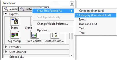 В первую очередь нам необходима последовательность битов информации, которую мы хотим передать. Получить ее можно с помощью блока MT Generate Bits. Щелкнем правой кнопкой мыши на пустом месте блок-диаграммы. Для удобства закрепим палитру функций, а также с помощью кнопки Customize изменим внешний вид палитры: CustomizeView This Palette AsCategory (Icons and Text).