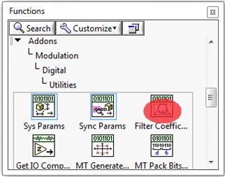 Следующий блок – это генератор коэффициентов для формирующего и согласованного фильтров MT Generate Filter Coefficients. Найдем мы его там же, где и блок генератора параметров.