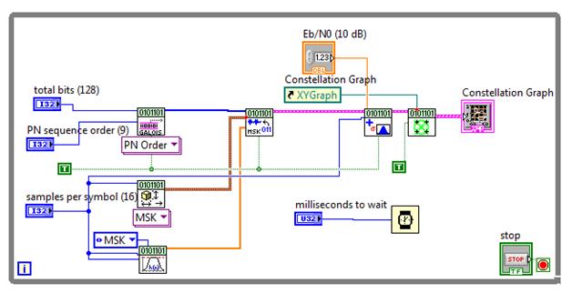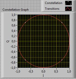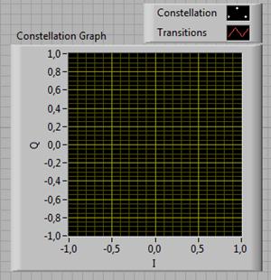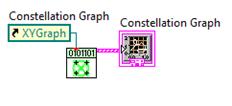 Можно заметить, что на лицевой панели блок MT Constellation Graph состоит из блока MT Format Constellation, осциллографа Constellation Graph и ссылки на этот осциллограф. Данный блок можно было собрать вручную, добавляя обычный XY Graph (ControlsExpressGraph IndicatorsXY Graph на лицевой панели) и блок MT Format Constellation (FunctionsAddonsModulationDigitalVisualizationMT Format Constellation на блок диаграмме), а затем форматируя осциллограф для отображения именно сигнального созвездия.