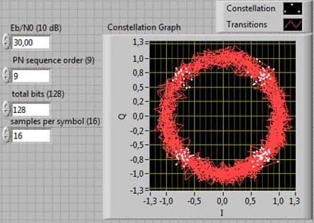 Как видим, векторная диаграмма показывает, что сигнал действительно зашумлен. Чем меньшее задавать значение сигнал/шум (Eb/No), тем больше будет зашумлен сигнал в канале передачи данных.