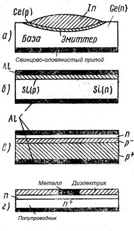 1. Методом сплавления получают германиевые диоды (рис.12, а). При этом таблетка индия при нагреве расплавляется и растворяет германий. Образуется p -слой, легированный индием (p -типа). С припоем создается невыпрямляющий контакт. Переход несимметричный, (pp >> nn) электронная составляющая тока много меньше дырочной