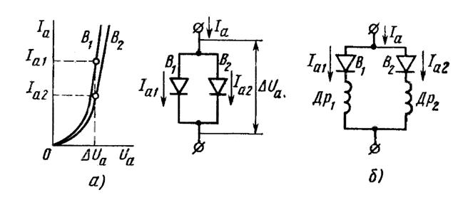 Рис. 20. Последовательное соединение вентилей. а) вольт-амперные характеристики; б) схема соединения.