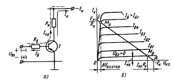 Рис. 68. Схема транзисторного ключа и вольтамперные характеристики транзистора.